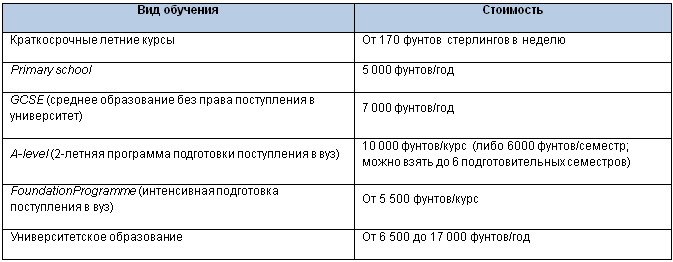 - International colleges – комплектуются только иностранными студентами от 14 до 18 лет. Программа колледжа соответствует среднеобразовательной программе UK, кроме того, международные колледжи предлагают 1–2 годичные Foundation Courses, специализирующиеся на подготовке к университету. Такие курсы могут быть удачным решением для выпускников российских школ, желающих получать высшее образование в Англии.